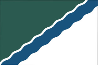 The flag is diagonally divided into green and white portions by a blue wavy line. The green field symbolizes health and Siberia’s rich natural resources, and the white field symbolizes Siberia’s purity and snow. The blue sling with white waves represents the Ob River on which the city stands.